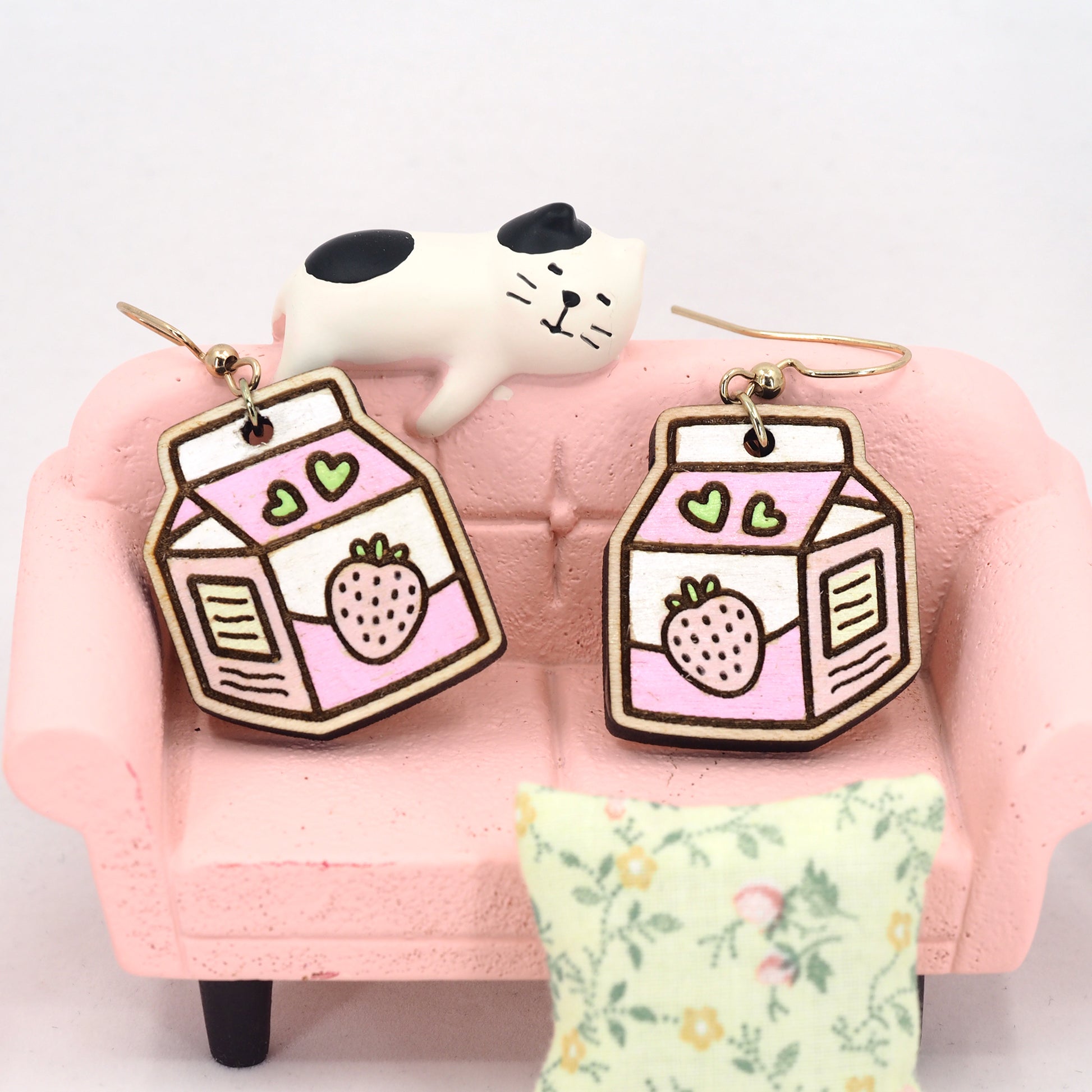These delightful earrings are perfect for those who adore cute and whimsical accessories. Each pair features a laser-cut wood design shaped like a tiny milk carton, with intricate details hand-painted to bring out the charm. Available in three adorable flavors - Strawberry Milk, Peach Juice, and Orange Juice, and Lemonad - these earrings are sure to add a touch of kawaii style to any outfit. Lightweight and comfortable, they are ideal for everyday wear or as a quirky gift for a friend who loves unique jewelry. Add a splash of fun and sweetness to your look with these charming milk carton earrings!